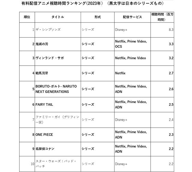 直近の2024年のアニメ視聴のランキングをみると、日本の作品で上位に入っているのは3作品で、いずれもマンガが人気で、息の長い作品である。マンガの売れ行きも良い作品だ。
