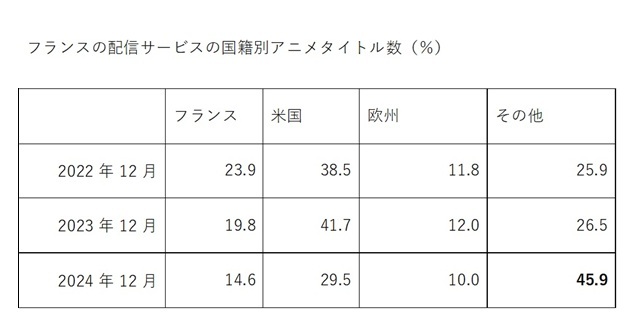 ただし、2024年のランキングで日本アニメのタイトルが減少した背景には、視聴時間に占める日本アニメのシェアが減少しているということもあるようだ。2024年12月末での配信タイトル数を国籍別で見ると、「その他」の割合が45.9%と半数近くなっている。このその他の大半が日本アニメ(39.2%)と、日本アニメの配信数は大幅に増加している模様だ。